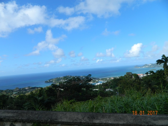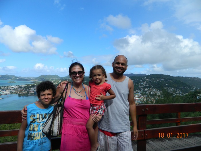 No trajeto, nosso guia nos informou que estávamos seguindo para Morne Fortune, uma cidade próxima de Castries. O motorista começou a subir uma montanha e fomos conversando com o guia todo o caminho. Nosso primeiro ponto de parada foi num mirante. Valeu a pena!  A vista é simplesmente linda! O nosso guia, muito fofo, ainda tirou a nossa foto!